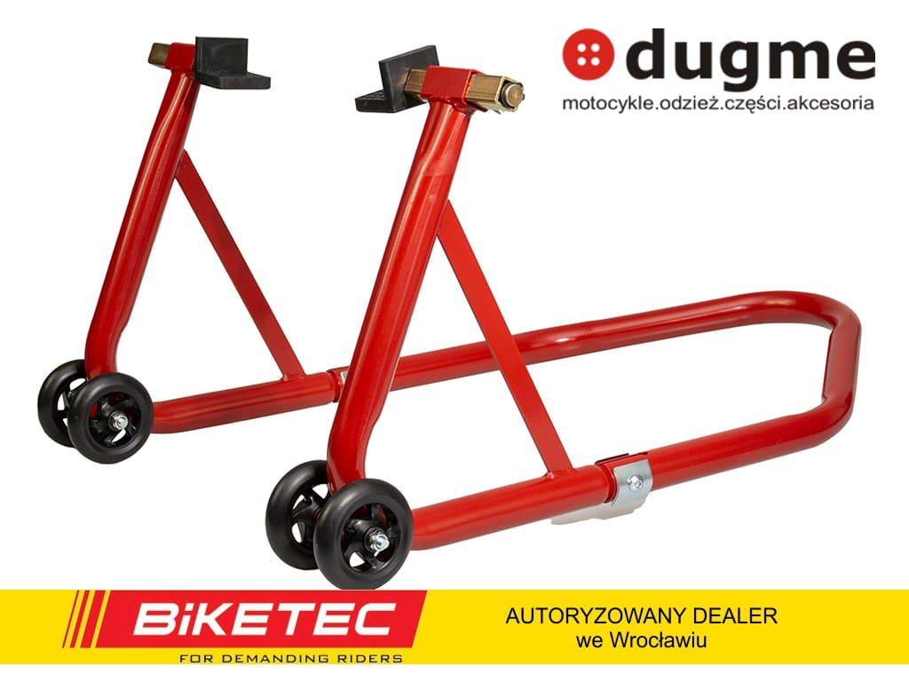 BIKETEC PRO PODNOŚNIK STOJAK MOTOCYKLOWY POD GŁÓWKĘ RAMY + ADAPTERY TYP-L POD TYLNY WAHACZ (TRZPIENIE 11,15,18,20,24 MM) KOLOR CZERWONY