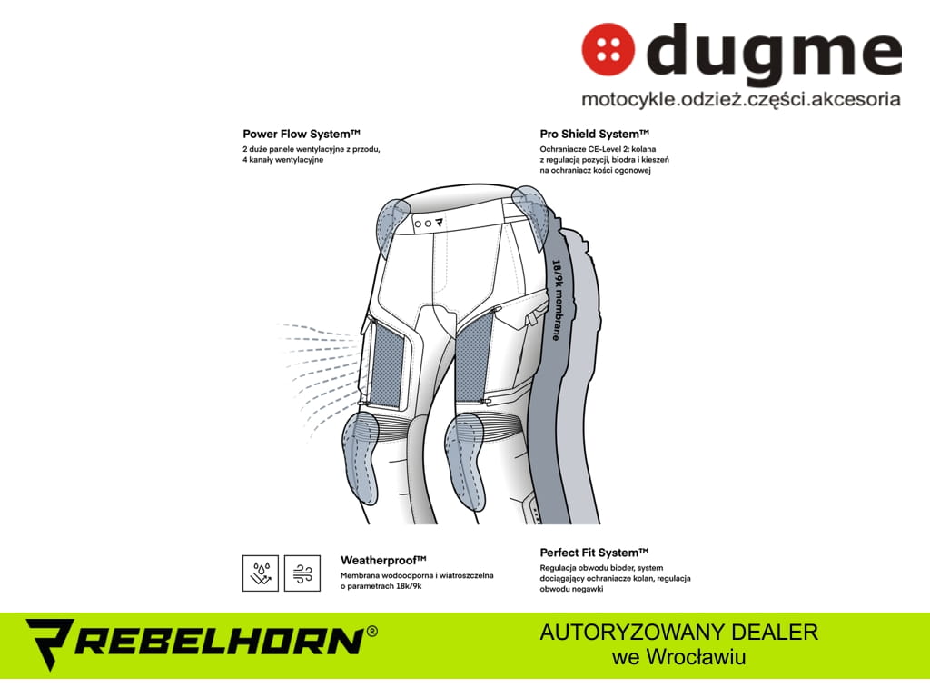 - Nogawki: 4 regulowane kanały wentylacyjne