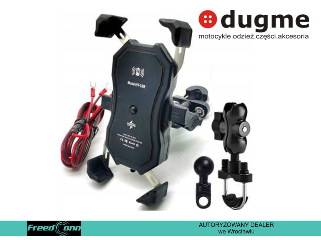 - Uchwyt FreedConn MC1W z ładowaniem indukcyjnym z 4 ramionami zakończonymi gripami, ładowarką USB, włącznikiem i kablem