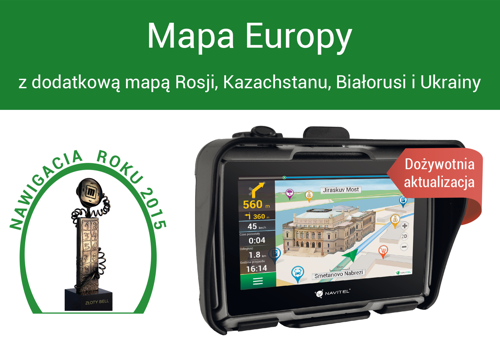 Nawigacja motocyklowa z dodatkowym uchwytem samochodowym w zestawie. Dożywotnia aktualizacja map, 45 krajów Europa + pełna mapa Rosji, Ukrainy, Białorusi i Kazachstanu.