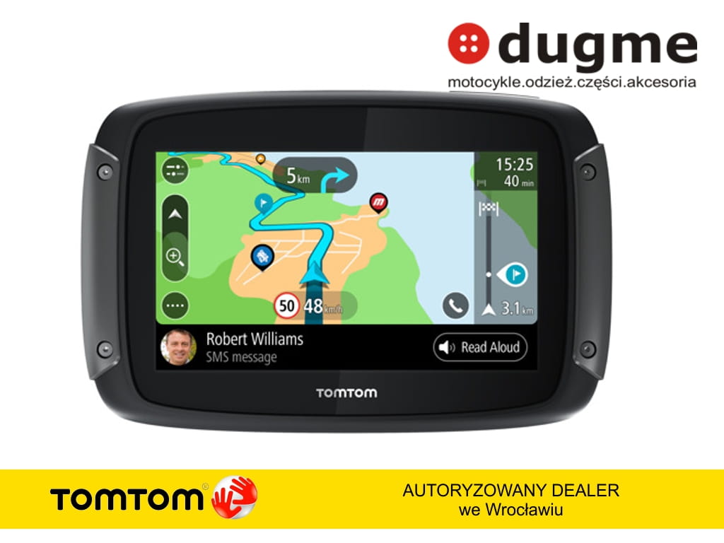 Wytrzymałe urządzenie TomTom Rider o metalowych krawędziach ma odporną na warunki pogodowe i upadki konstrukcję o stopniu ochrony IPX7. Jest wyposażone w szybki czterordzeniowy procesor i uruchamia się nawet pięć razy szybciej. Urządzenie nawigacyjne dla motocykli jest wyposażone w uniwersalny uchwyt RAM, dzięki czemu możesz wyruszyć w drogę szybciej niż kiedykolwiek wcześniej.